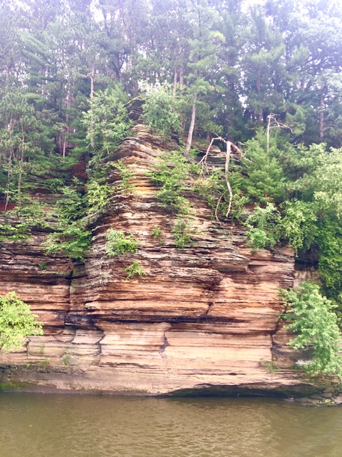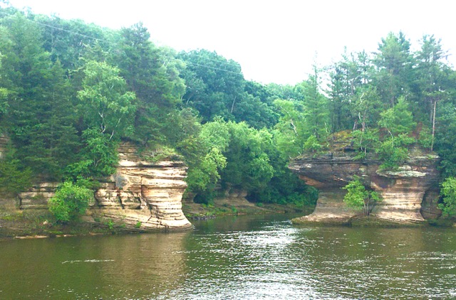 Wisconsin Dells, the waterparks capital of the world, was just a few miles from our campsite. I love a good water slide as much as anyone, but because we were traveling with a puppy, it would have been an impractical choice for an activity. We opted, instead for a ride down the Wisconsin River, to check out the lower Dells. It was raining, but we had rain gear. Gypsy has a semi-waterproof coat and we have learned to almost welcome the smell of wet dog. Puppy Love will make you tolerant in ways you would never expect.