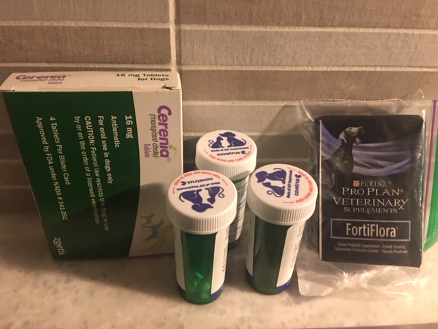 The Vet was suggesting that she ate something she should not have eaten (duh…), but also was concerned about giardia, diet changes and nervous anxiety combining to cause pancreatitis. Wow. I mean, yes, she had the trots, and yes, she was drooling to beat the band, but she was certainly not lethargic. She was full of energy and wagging her tail. The bloodwork came out fine, and yet, we were sent home with antibiotics, probiotics, special food, tranquilizers, and anti-nausea meds. Ching! Ching! $$$$