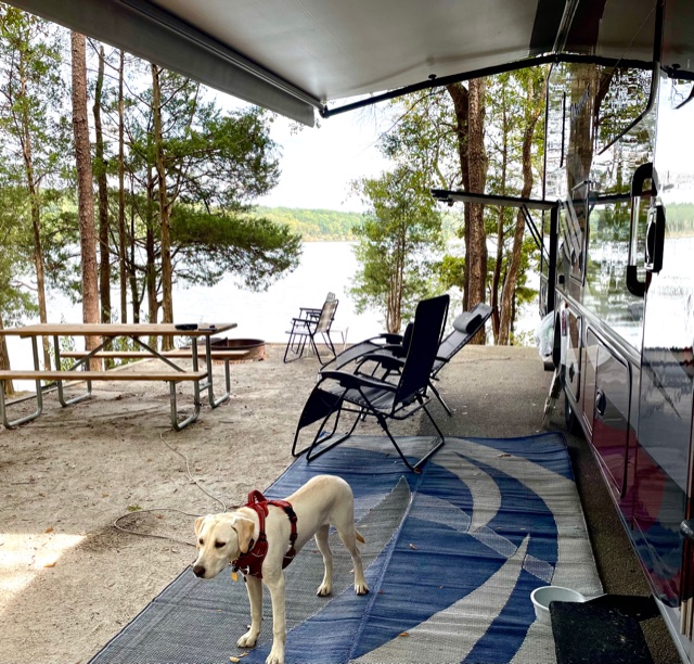 We arrived at Lake Wateree State Park in Winnsboro, SC and were delighted with our campsite. Situated overlooking the lake, with lake access for the dog, it just could not have been more perfect. Gypsy has become quite the swimmer. She’s a Labrador, with webbed feet, so swimming should be second nature. It took some frantic thrashing and splashing at the beginning, but after being encouraged to go deeper into the lake, with each toss of a stick, she soon segued into a graceful, swimmer’s rhythm