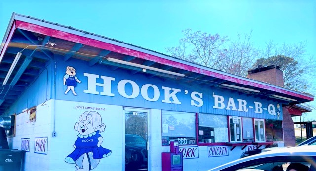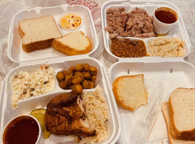 Well, we finally did it. We finally made it to Hook’s Bar-B-Q. Our meals were packaged in the finest quality Styrofoam, and we were awarded bonus portions of white bread and pound cake. Yes, white bread, the type with absolutely no nutritional value; the type you can roll into cohesive, little balls for use as bait or ammo. I got two slices of white bread. My husband got three. Either he looked really hungry, or the slices were all stuck together, as is the tendency of overly processed white bread.
