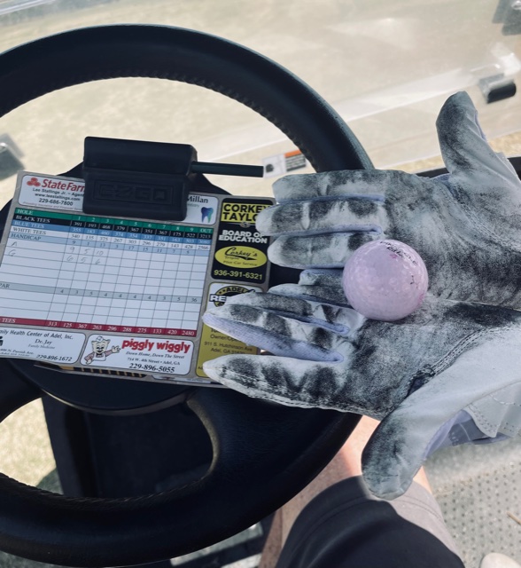 On our first day out, the clubs seemed to be melting in my hands. My palms were black. My fingers were black. The seat in the golf cart was turning black. Clearly this was going to be a 9-hole day. We headed to the club house, but they only had men’s gloves, all of which were too large. We got a voucher for another 9-hole day, and headed to Walmart in search of ladies golf gloves.
