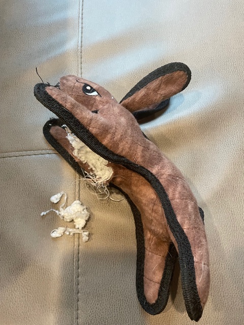 In other news, it took Gypsy exactly three days to completely gut “Bun-Bun”, her (Ha! Ha!) indestructible, tough toy that she received for her recent birthday.