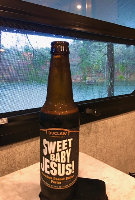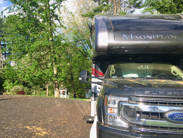 Not like the April showers that bring May flowers. It was more like the stuff that made Noah decide it was time to build a boat. We pulled into our site just in time for the cloudburst from hell. Getting an RV backed into the correct location means getting outside to make sure there are no obstacles and that the water and electric are accessible. Even with umbrellas we were drenched to the bone, which is uncomfortable when it is breezy and 50 degrees.