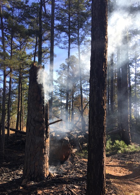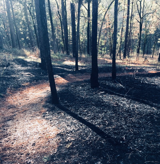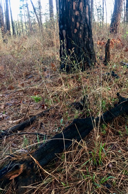 The storms did materialize last night but they were not of the magnitude that flights to Oz are made of. In fact, the rain, thunder and lightening ushered in an absolutely picture perfect day. It was already in the 60’s and sunny when we began out hike through the Big Pine Forest this morning. As we began our hike, we took note of all of the charred wood along the trail. We speculated that perhaps there had been a brush fire that had (luckily) been extinguished on time. As we progressed deeper into the woods, the odor of burnt wood became stronger. The trails were not well traveled, in fact we had not encountered a single soul until we had the good fortune to stumble upon a Park Ranger who was able to educate us about the controlled burns that were staged in the Spring. The forest floor, apparently, can be knee-deep in pine needles and leaves, which is a tremendous amount of fuel for an errant ember. I was amazed that they could keep even a ‘purposeful’ burn under control in a dense forest. They manage the flames with dirt-paths acting as fire-breaks, and more dirt used as a retardant. Fighting fire with fire.