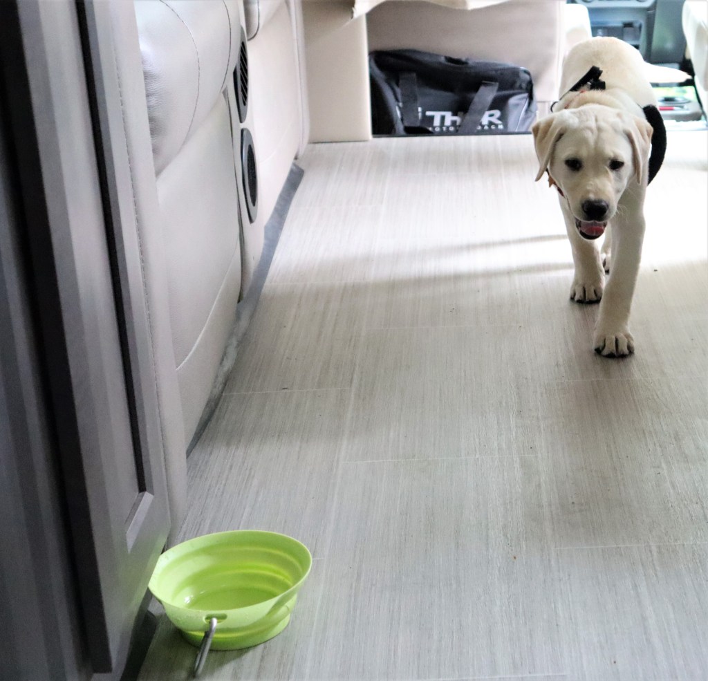 We anticipated that there would be a hurdle or two in introducing Gypsy to the RV. Our housebreaking efforts have been miraculously successful. But this home has wheels, and it smells different, and there are no sliding glass doors to stare out of.
