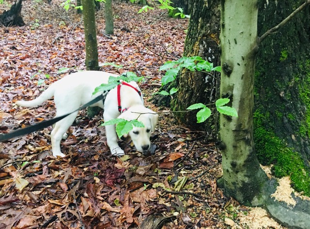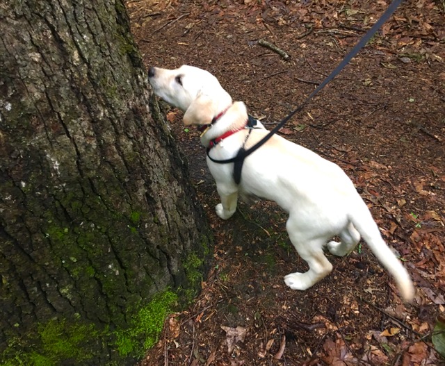 So far, leash training has been a complete bust. Gypsy has a pronounced case of ADD. She is wary of cars, bicycles, lawnmowers, large dogs, blowing leaves and most people. Staying focused enough to walk 10 yards at a time is taxing. I tempt her with treats, cajole her with compliments and lead her with (mostly) gentle tugs. Okay, sometimes I semi-drag her. Naturally, I was anticipating an aggravating 1st hiking experience. Surprise! Although she had to stop to sniff every, single tree, she eagerly pranced down the trail, managing a few miles without any strain. I was relieved. Maybe we will have that hiking hound after all.