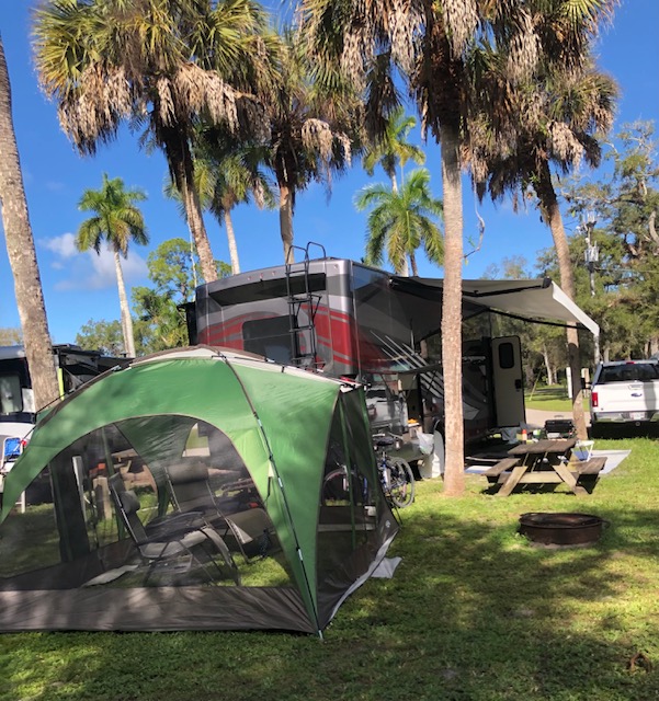 The campsites at Collier Seminole are “tight” but there was adequate room at the rear of the motorhome to erect a screen room, which is necessary. The bugs are brutal at dawn and dusk. The park offers trails, boat ramps, and bike paths. The rangers are extremely knowledgeable and kind. We took advantage of a guided hike on New Years morning. Henry, our guide, did an amazing job of introducing us to the flora and fauna in the area. It was somewhat unsettling to be hiking through areas that are inhabited by bear, bobcats, panthers, alligators and rattle snakes but Henry assured us, that (aside from rattle snakes) we were unlikely to encounter these creatures.