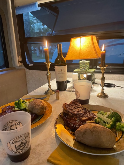 I won’t disappoint. We just received a recall notice on the RV. It seems the propane line was threaded through a spring of some sort, which causes wear on the gas line. Good thing we didn’t know that when we lit those candles last night. KABOOM!